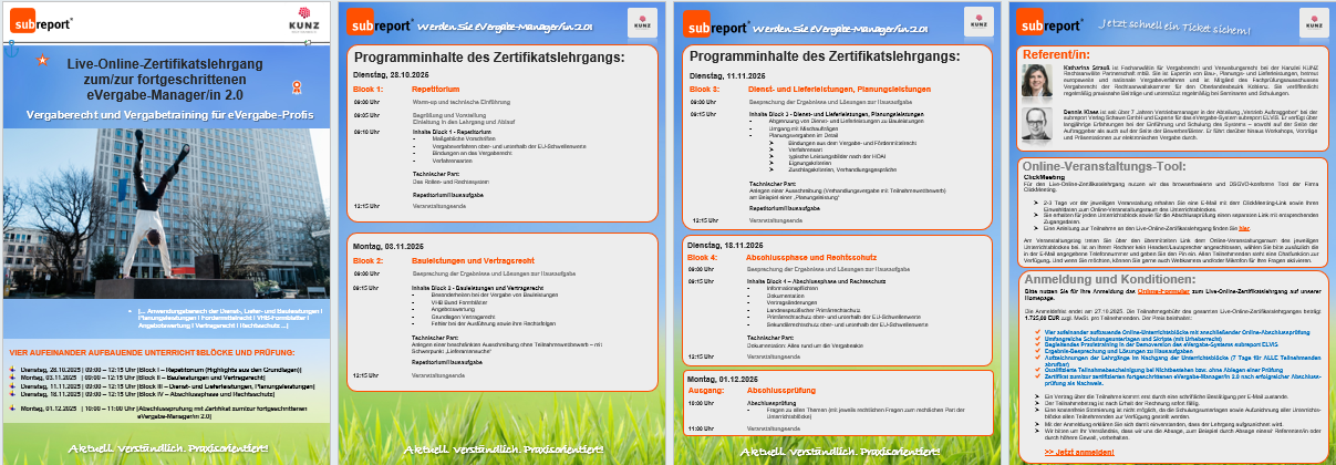 Der Countdown läuft: Ab dem 28. Oktober 2025 startet unser 4-teiliger Live-Online-Zertifikatslehrgang zum/zur fortgeschrittenen eVergabe-Manager/in 2.0. Wer bereits Erfahrung im Vergaberecht und in der elektronischen Vergabe mitbringt, kann hier sein Fachwissen auf den neuesten Stand bringen und gezielt erweitern. Achtung: Die Plätze sind begrenzt – jetzt schnell anmelden!
