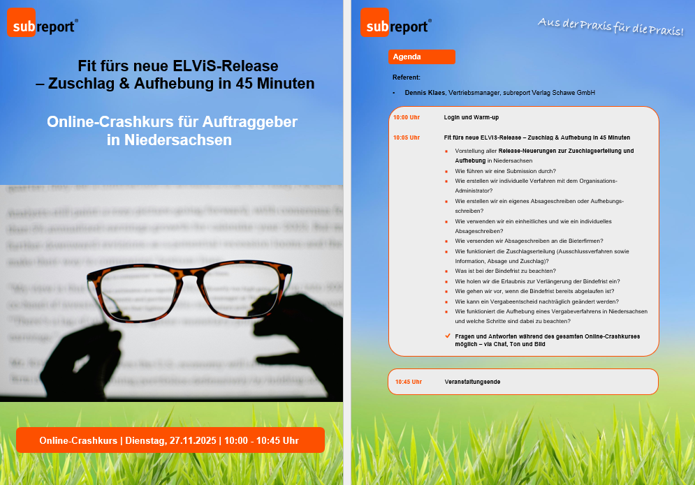 27.11.2025: Fit fürs neue ELViS-Release – Zuschlag & Aufhebung in 45 Minuten I Online-Crashkurs für Auftraggeber in Niedersachsen