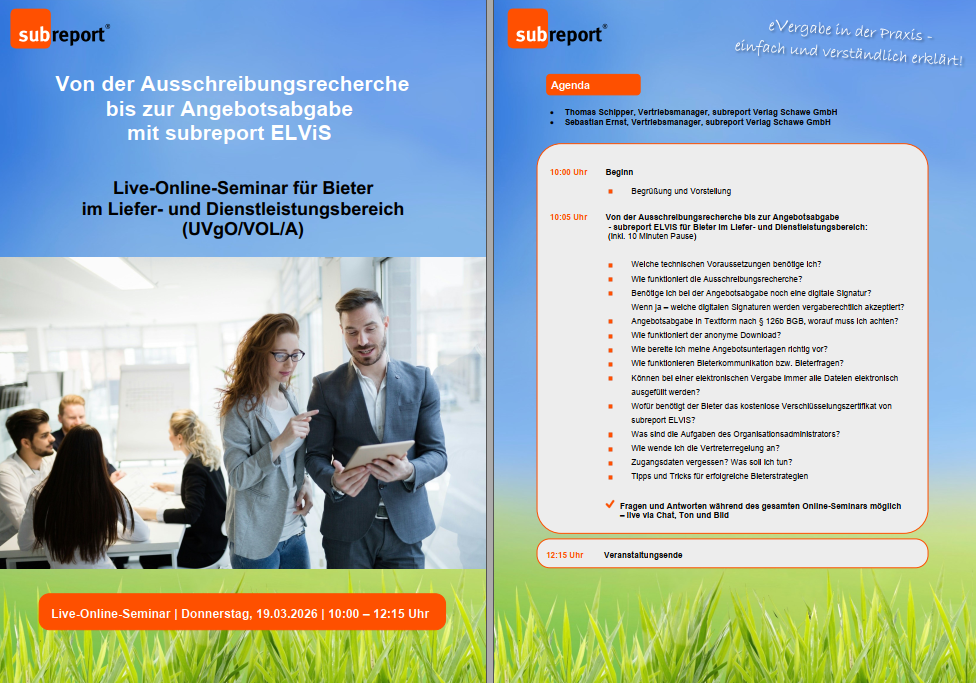 19.03.2026: Live-Online-Seminar für Bieter I Von der Ausschreibungsrecherche bis zur Angebotsabgabe mit subreport ELViS (UVgO/VOL/A)