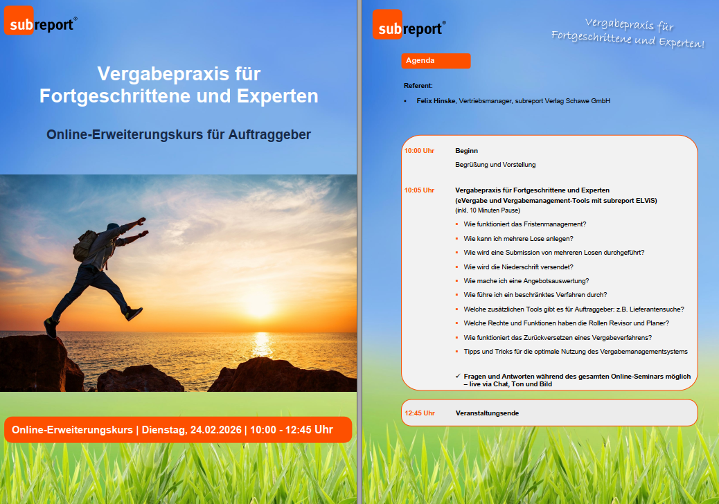 • Theorie & Praxis: Nach einem kompakten Einstieg zeigen wir Ihnen Schritt für Schritt die erweiterten Funktionen von subreport ELViS – vom Fristenmanagement über das Anlegen mehrerer Lose bis zur Angebotsauswertung und Durchführung beschränkter Verfahren.