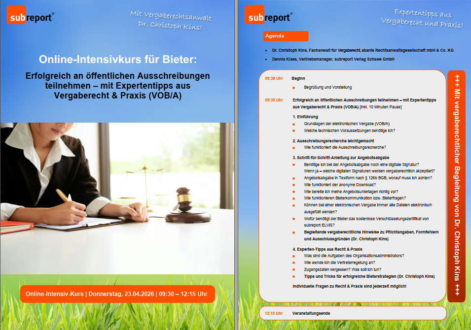 23.04.2026: Online-Intensivkurs für Bieter I Erfolgreich an öffentlichen Ausschreibungen teilnehmen – mit Expertentipps aus Vergaberecht & Praxis (VOB/A)