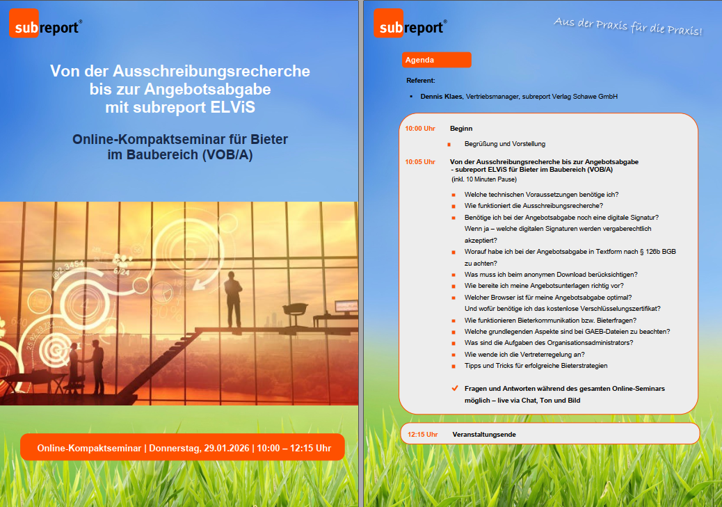 29.01.2026: Online-Kompaktseminar für Bieter I Von der Ausschreibungsrecherche bis zur Angebotsabgabe mit subreport ELViS (VOB/A)